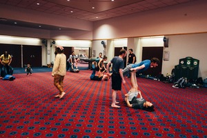 The photograph captures a lively scene of group members engaged in playful acrobatics within a spacious, warmly lit room. A vibrant carpet anchors the composition, while the mixed expressions of joy and concentration convey a sense of camaraderie and fun. The soft overhead lighting enhances the casual atmosphere, inviting viewers into this moment of shared creativity and movement.