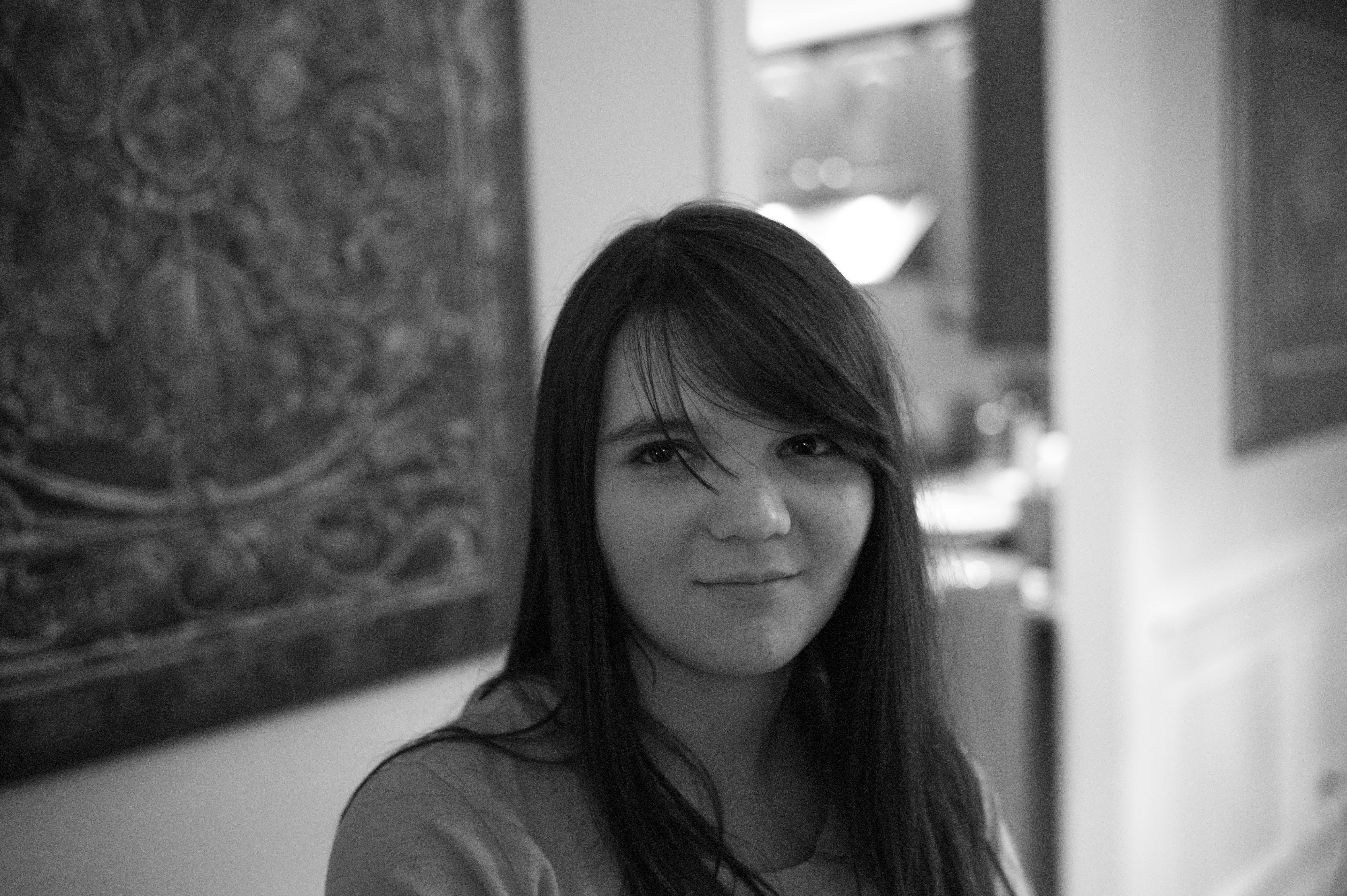 In this black and white photograph, a young woman gazes thoughtfully at the camera, her expression a blend of serenity and introspection. Soft, diffused lighting casts gentle shadows that highlight her features while blurred background elements evoke a sense of home. The composition draws the eye to her face, making it the poignant focal point amidst the subdued environment.