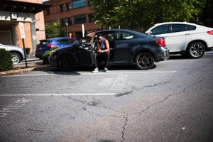 A solitary figure sits on the edge of an open car door in a sun-drenched parking lot. The atmosphere is reflective, with soft shadows dancing on the pavement, highlighting a moment of pause amidst the urban backdrop. The contrasting colors of the vehicles and vibrant greenery impart a sense of calm amidst the hustle of city life.