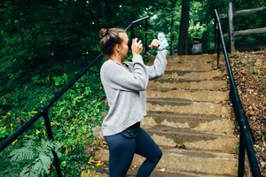 A young woman playfully engages with a stuffed toy while standing on a set of stone steps in a lush, green environment. The ambient light filters gently through the surrounding trees, creating a warm and inviting atmosphere that exudes a sense of joy and spontaneity. Her casual attire and expressive posture add to the carefree spirit of the scene, making it feel both vibrant and relatable.