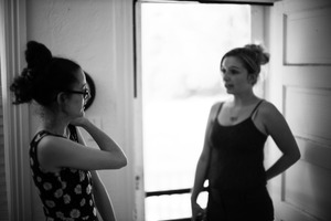 Two women stand in a doorway, their expressions hinting at a shared conversation or unspoken emotions. The soft lighting and monochrome tones create an intimate atmosphere, emphasizing their connection as they engage with one another against the backdrop of an open exit. The focus on the figures, with a blurred exterior, draws attention to their interaction and the warmth of the moment.