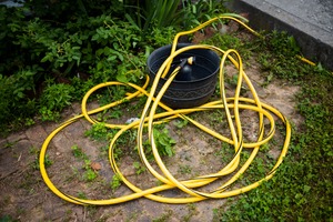 A bright yellow garden hose lies in a chaotic coil beside a decorative black pot, blending functionality with disarray. Lush green foliage surrounds the scene, evoking an earthy, tranquil mood amidst the randomness. Soft, natural light enhances the vibrant colors, creating a sense of warmth and life in an everyday setting.