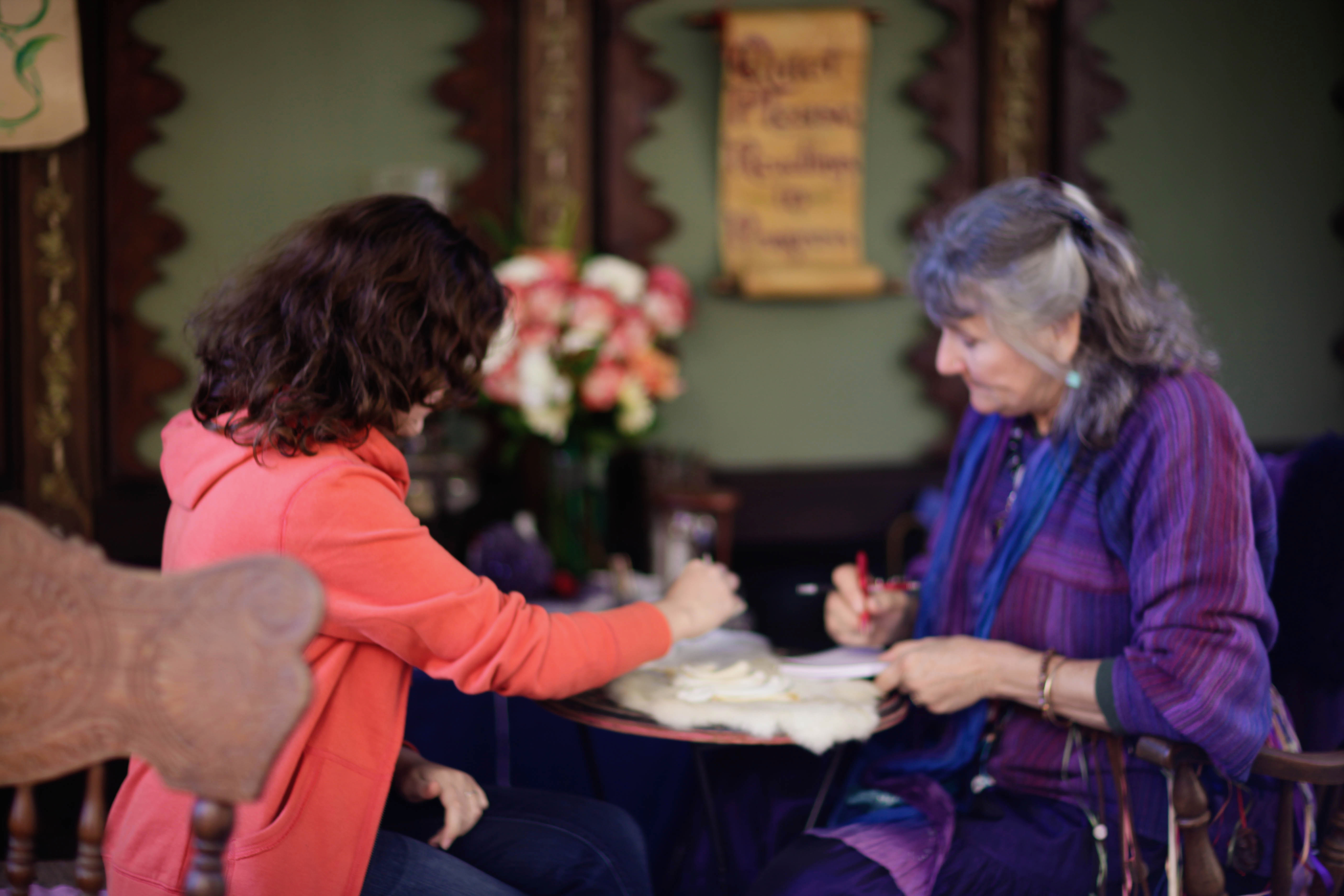 In a warmly lit room, two women engage in a collaborative artistic endeavor, sharing intimate moments of creativity. The soft focus and gentle colors create a serene atmosphere, emphasizing a sense of connection and purpose. Floral accents and ornate surroundings add a touch of richness to the scene, inviting viewers into their creative space.