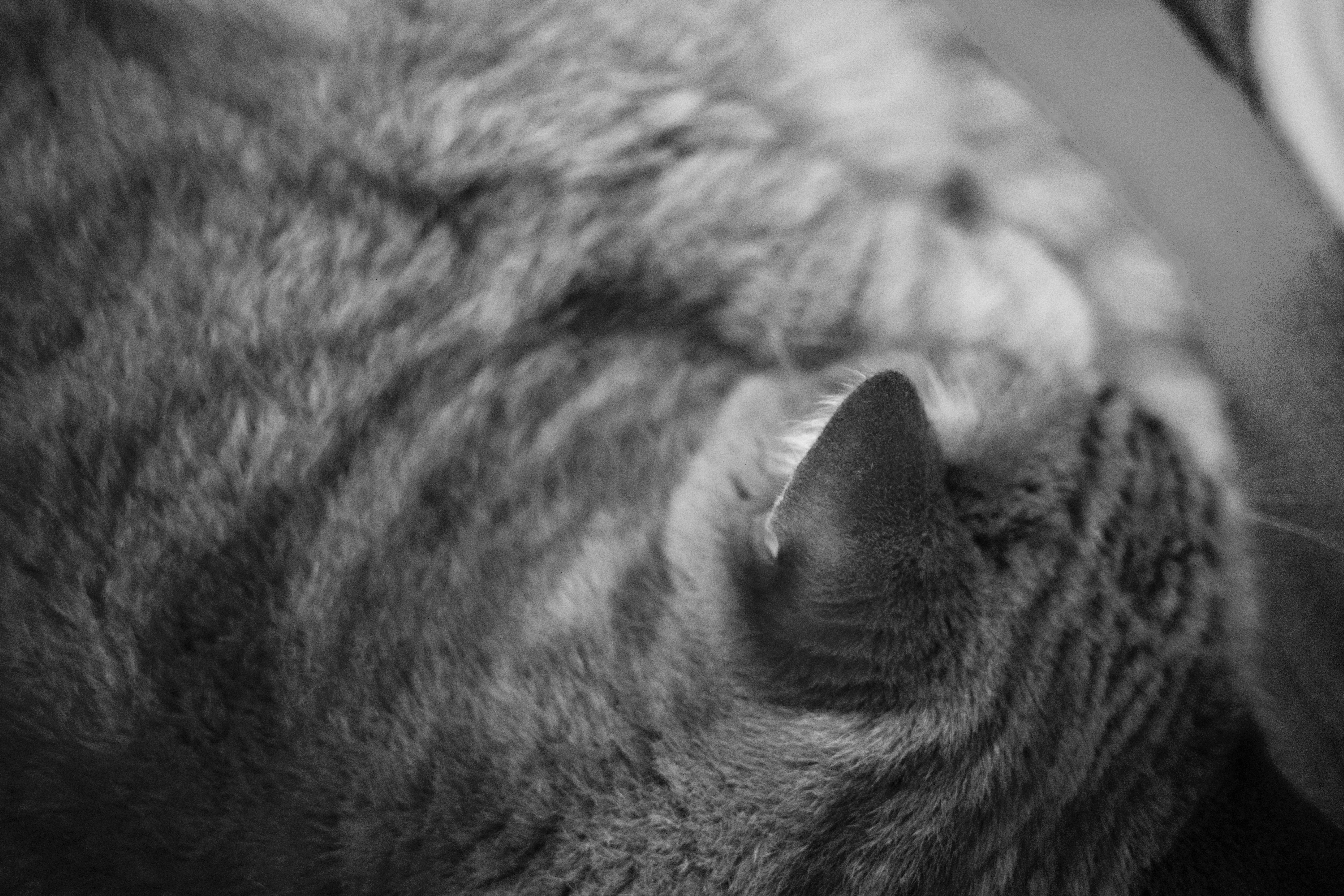 A close-up of a cat's ear softly nestled in its cozy fur, creating an intimate portrait that evokes a sense of tranquility. The monochromatic tones enhance the peaceful mood, emphasizing the gentle curves and textures of the fur. The shallow depth of field draws attention to the ear, inviting viewers to share in the serene moment of rest.