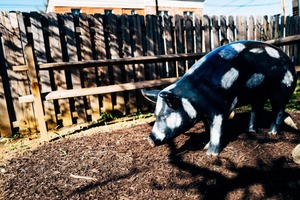 A life-sized pig sculpture stands in a patch of brown mulch, its glossy black and white paint catching the warm sunlight. The rustic wooden fence in the background adds a charming, pastoral feel, while long shadows play across the ground, enhancing the tranquil and playful mood. The composition invites a closer look at the delightful detail of the sculpted animal in this inviting outdoor space.