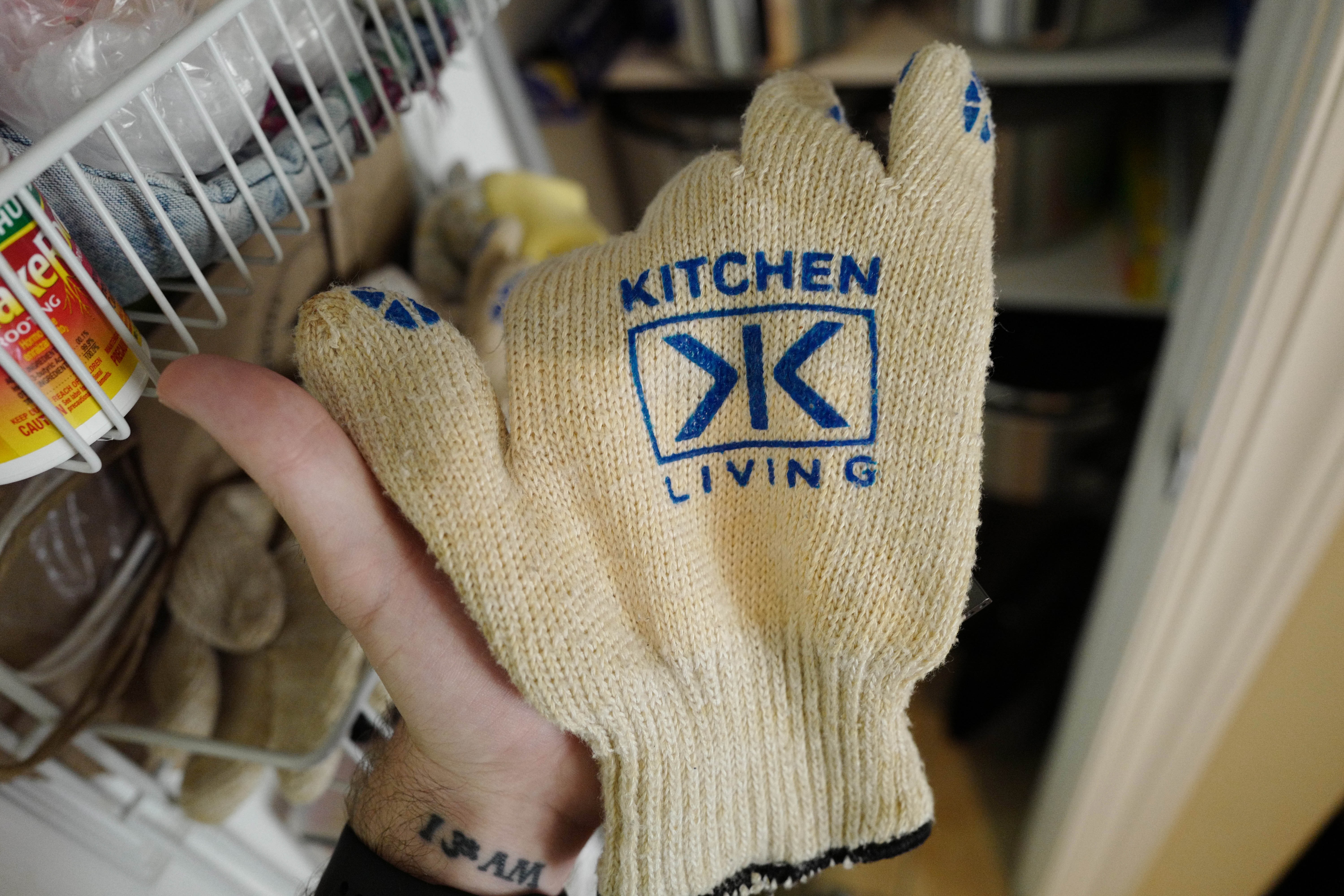The photograph captures a hand holding a textured kitchen glove, its bright blue lettering reading 'KITCHEN LIVING'. The composition emphasizes the glove against a softly blurred background, creating a warm, inviting atmosphere that speaks to the everyday tasks and comfort of home cooking.
