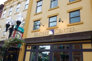 The photograph showcases the vibrant facade of the 'Bright Center', where warm yellow tones contrast beautifully with the dark trim. The lighting from the wall sconces casts a welcoming glow, enhancing the inviting atmosphere. Potted flowers and street signs add a touch of charm, grounding the image in a lively urban context.