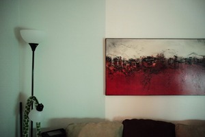 A cozy corner of a living space features a striking abstract painting with deep reds and subtle textures, contrasting against a soft-lit wall. A tall lamp and a draped green object add layers to the composition, creating a warm, inviting mood. The overall ambiance feels intimate, inviting contemplation and warmth in its simplicity.