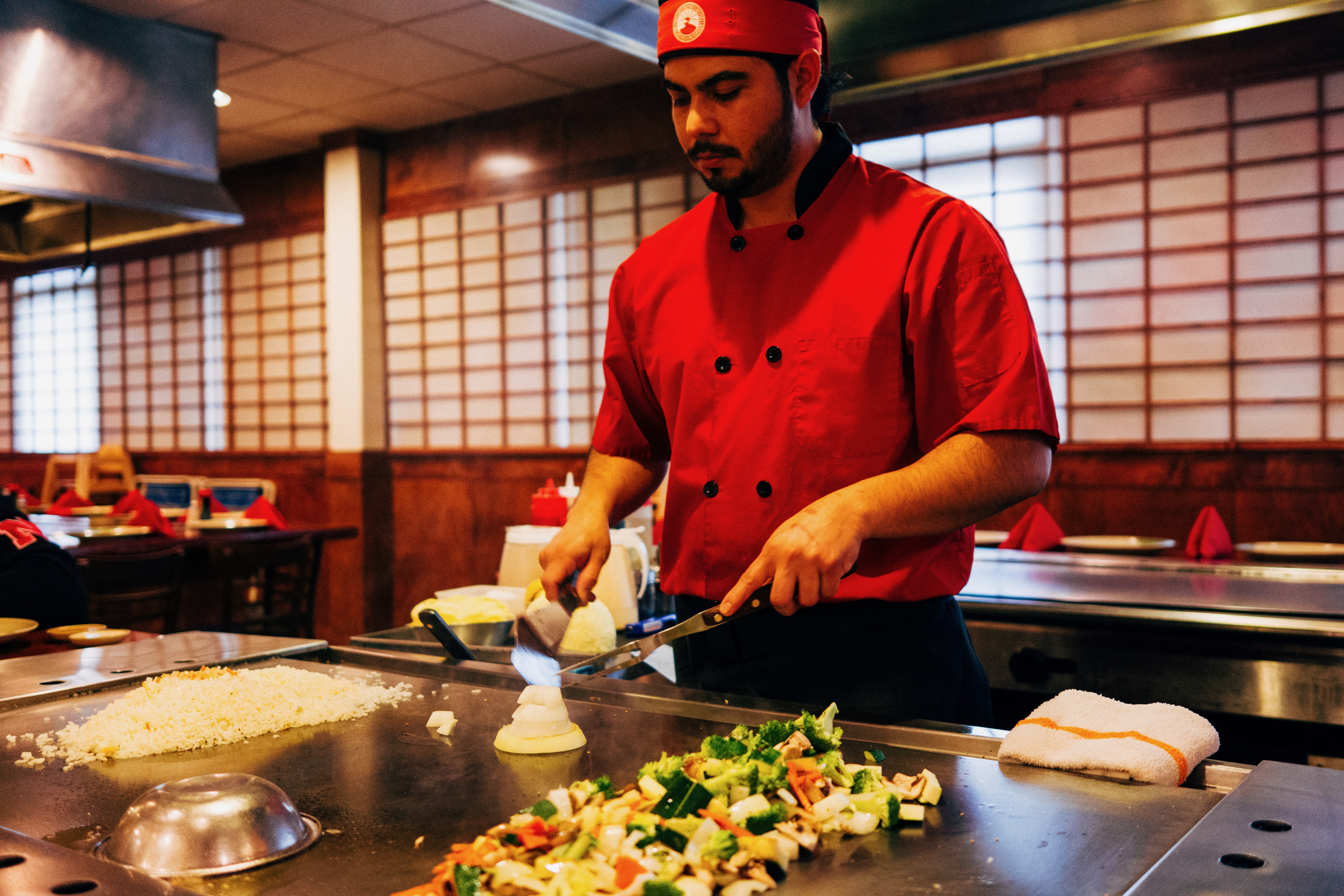 A focused chef clad in a vibrant red uniform skillfully prepares a colorful array of vegetables and rice on a sizzling teppanyaki grill. The warm, ambient lighting casts a cozy glow over the restaurant, enhancing the lively atmosphere of culinary creation. The dynamic composition, with the chef at the forefront, captures the artistry and skill of cooking in a social dining experience.