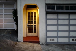 A solitary, illuminated door stands at the forefront, exuding a warm golden glow against the cooler tones of its surroundings. The stark contrast between the inviting light and the muted shadows creates an intimate yet slightly enigmatic atmosphere. With an overhanging archway framing the entrance, this composition invites curiosity while hinting at stories waiting within.