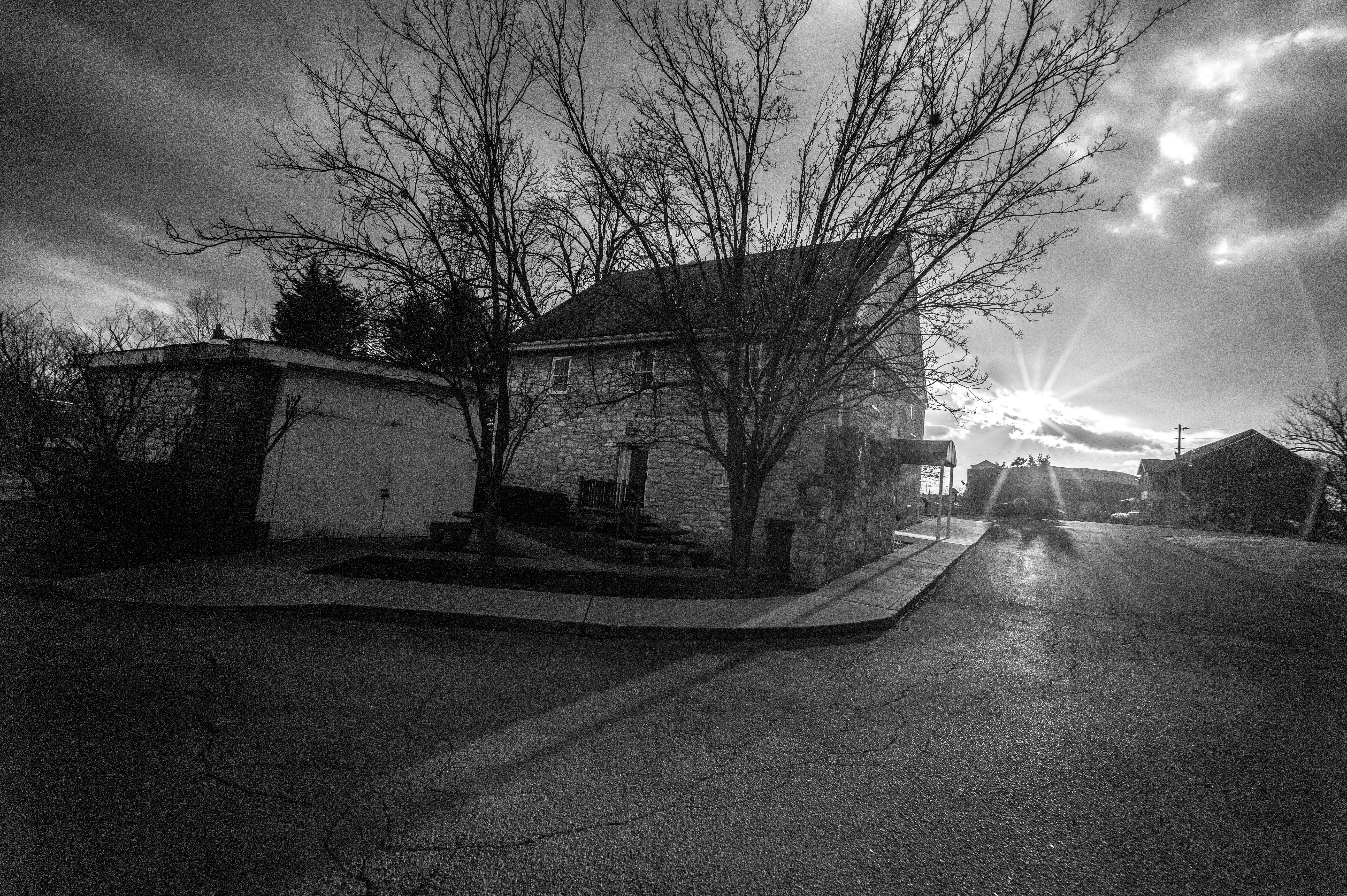 A solitary stone house stands at the corner of a quiet street, its rough texture emphasized by the stark monochrome lighting. The bare branches overhead reach out like fingers against a moody sky, while the sun struggles to break through the clouds, casting a soft halo of light. The composition invites contemplation, evoking a sense of stillness and the passage of time in a forgotten moment.