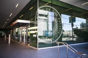The photograph captures the modern entrance of the University of the Pacific, where sleek glass walls reflect the surroundings and prominently display the university's emblem. The clean lines and minimalist design create a sense of openness and accessibility, while the bright, natural light enhances the inviting atmosphere. Subtle reflections of the campus provide a glimpse into the vibrant life within, merging architecture with academia beautifully.