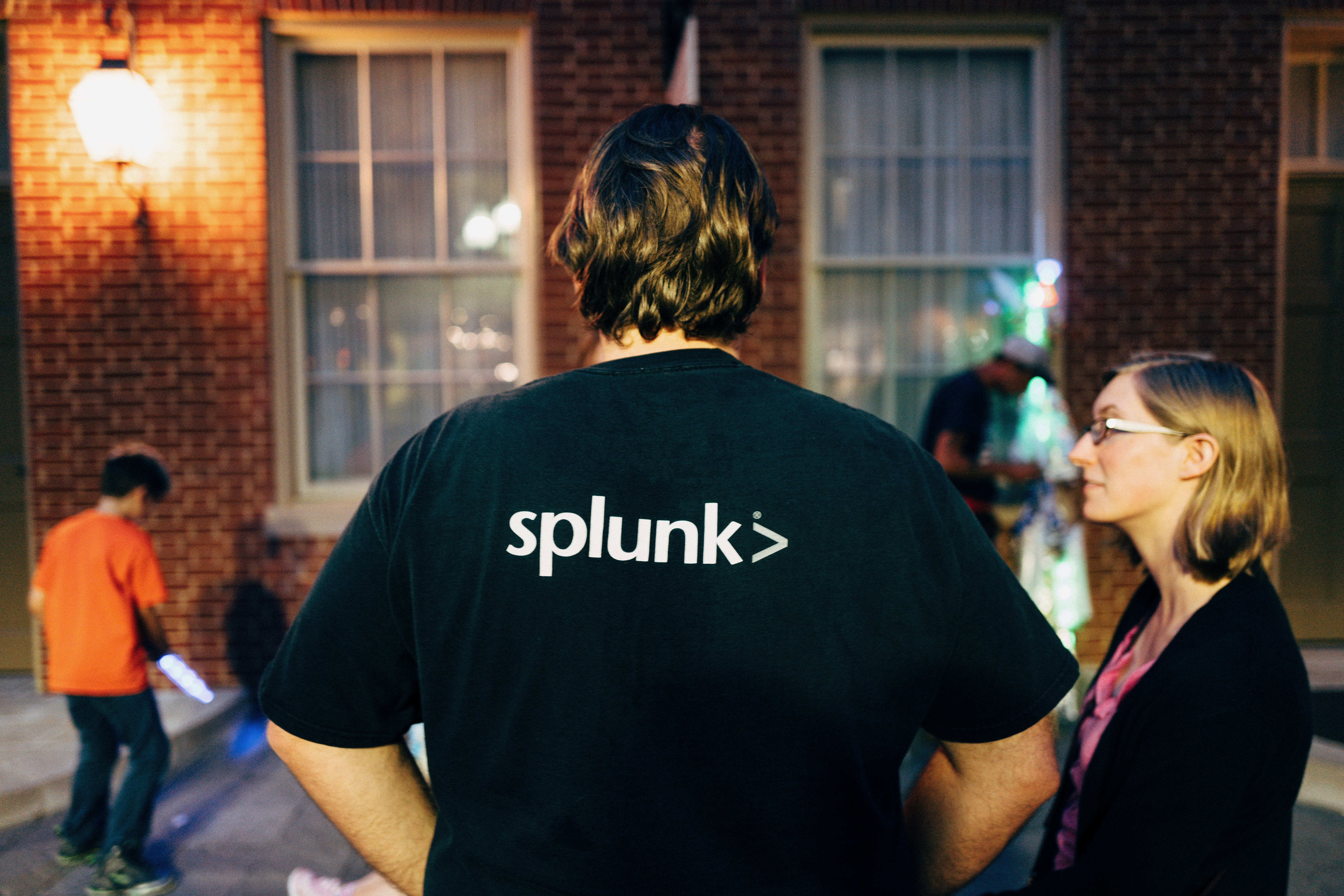 In a softly lit evening scene, a person in a black shirt with the word 'splunk' stands, their back turned toward the viewer, while a woman beside them engages in quiet conversation. The warm glow from nearby lights casts a welcoming ambiance, highlighting the relaxed mood and suburban charm of the setting. A child in a bright orange shirt is seen playing in the background, adding a hint of activity and life to the tranquil environment.