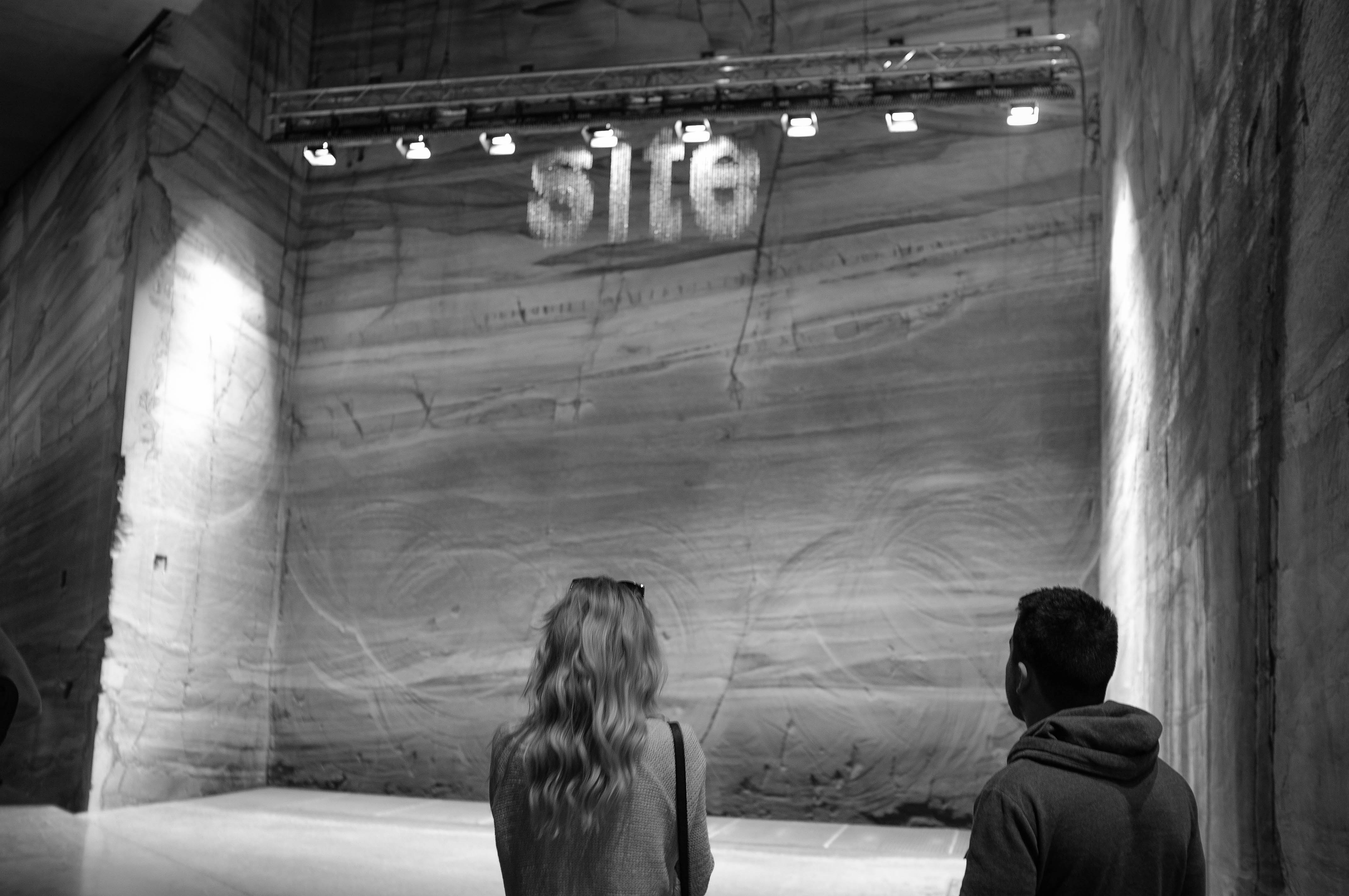 Two figures stand in contemplation within a cavernous, stone-walled space, their faces illuminated by the soft glow of spotlights above. The word 'site' is projected onto the textured wall, creating an intriguing contrast that invites reflection. The black-and-white tones enhance the solemnity of the moment, emphasizing the grandeur of the surroundings and the intimacy of the shared experience.