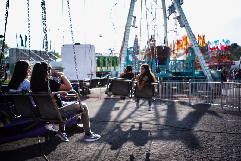 A group of young friends enjoys a moment on a swing ride at a bustling fair, their laughter palpable in the air. The soft afternoon light casts long shadows on the ground, creating an atmosphere of nostalgia and carefree joy. Colorful flags and rides in the background add vibrancy, enhancing the festive mood of the scene.