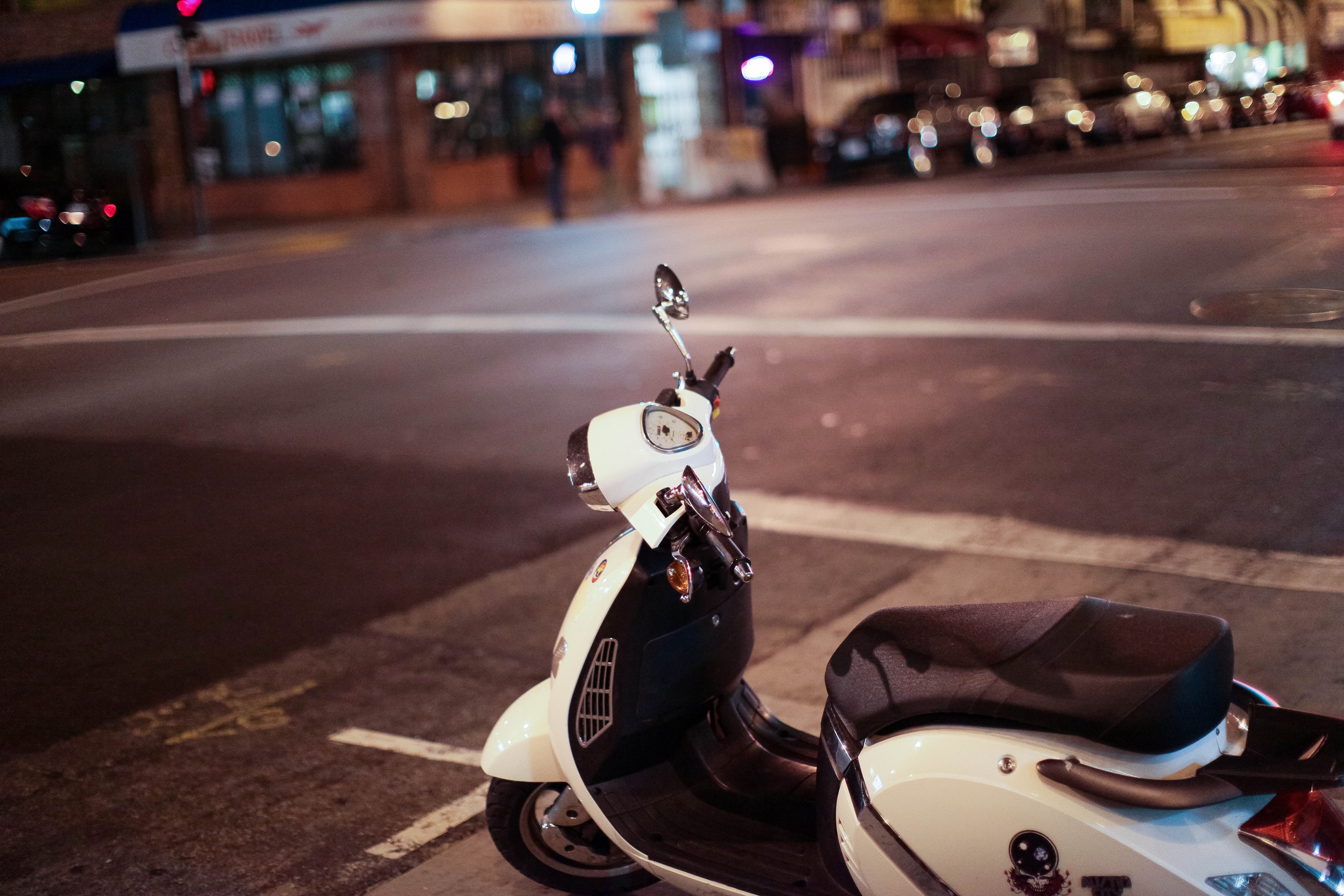 A solitary white scooter is parked at a quiet intersection, capturing a moment of stillness in the bustling urban night. Soft, ambient lighting from nearby shops casts a gentle glow, creating a contrast against the darkness of the street. This peaceful scene hints at adventure, evoking a sense of nostalgia and longing for nighttime escapades.