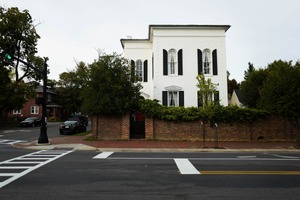 This photograph captures a classic white house with striking black shutters, exuding a sense of timeless elegance. The muted, overcast sky casts a soft, diffused light, enhancing the house's regal presence amid vibrant green foliage. The composition, with the house set back behind a charming brick wall, invites viewers to explore the understated beauty of the neighborhood.
