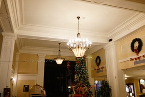 This photograph captures a beautifully decorated lobby during the holiday season, featuring an adorned Christmas tree and vibrant wreaths. The warm glow from the ornate chandeliers contrasts with the soft shadows, creating an inviting and festive atmosphere. Intricate architectural details frame the scene, enhancing the sense of elegance and celebration.