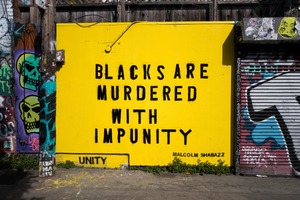 A vibrant yellow mural boldly declares a powerful message about racial injustice, demanding attention with its stark black lettering. The surrounding graffiti adds layers of context and emotion, creating a juxtaposition between the serious subject and the colorful street art aesthetic. The sunlight enhances the colors, casting shadows that deepen the urgency of the message.