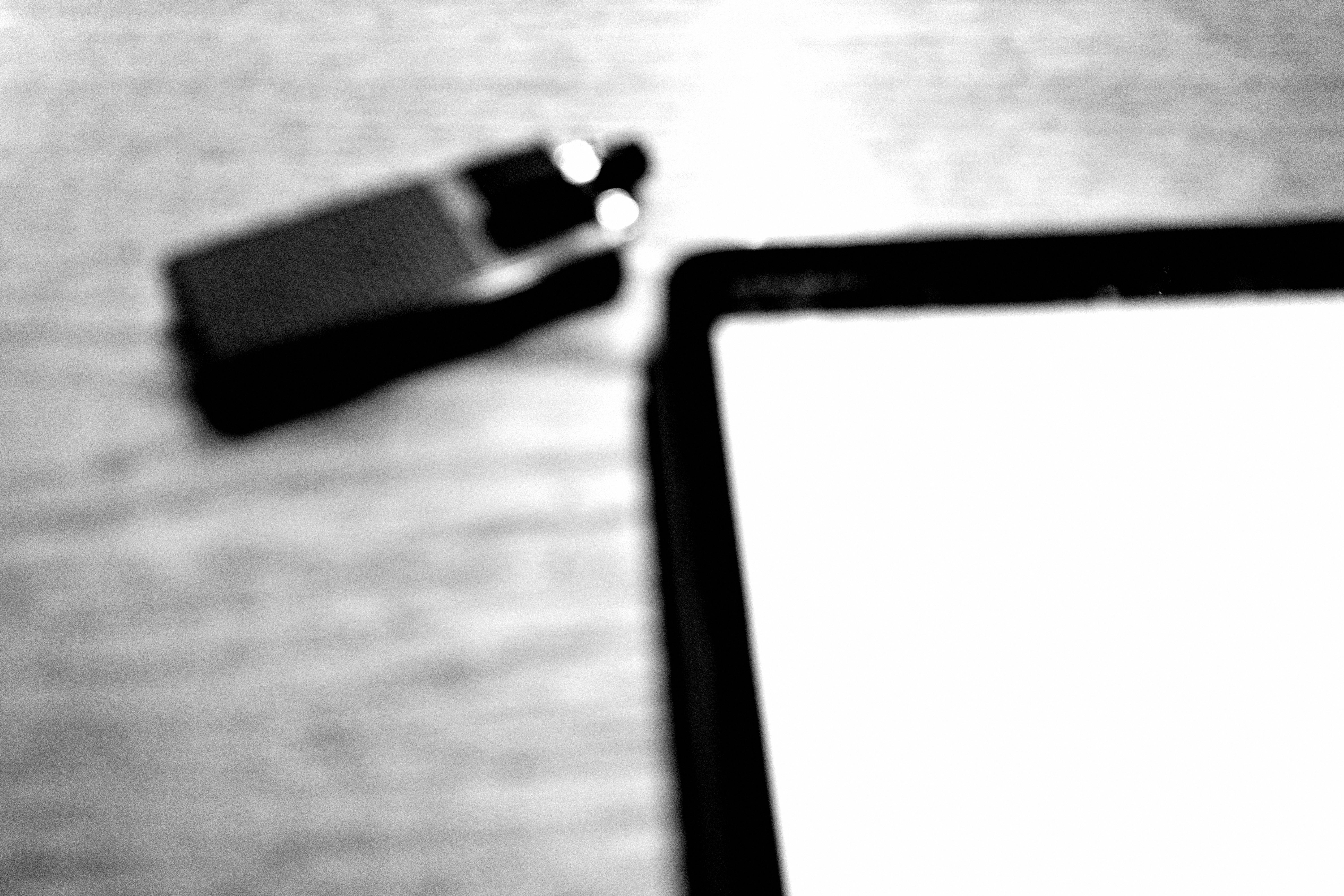This black-and-white photograph captures a softly blurred close-up of a lighter and the edge of a tablet, suggesting a fleeting moment of creativity or contemplation. The hazy focus evokes a sense of nostalgia, inviting viewers to reflect on the intersection of mundane objects and moments. The interplay of shadows and light adds depth, enhancing the mood of quiet introspection.