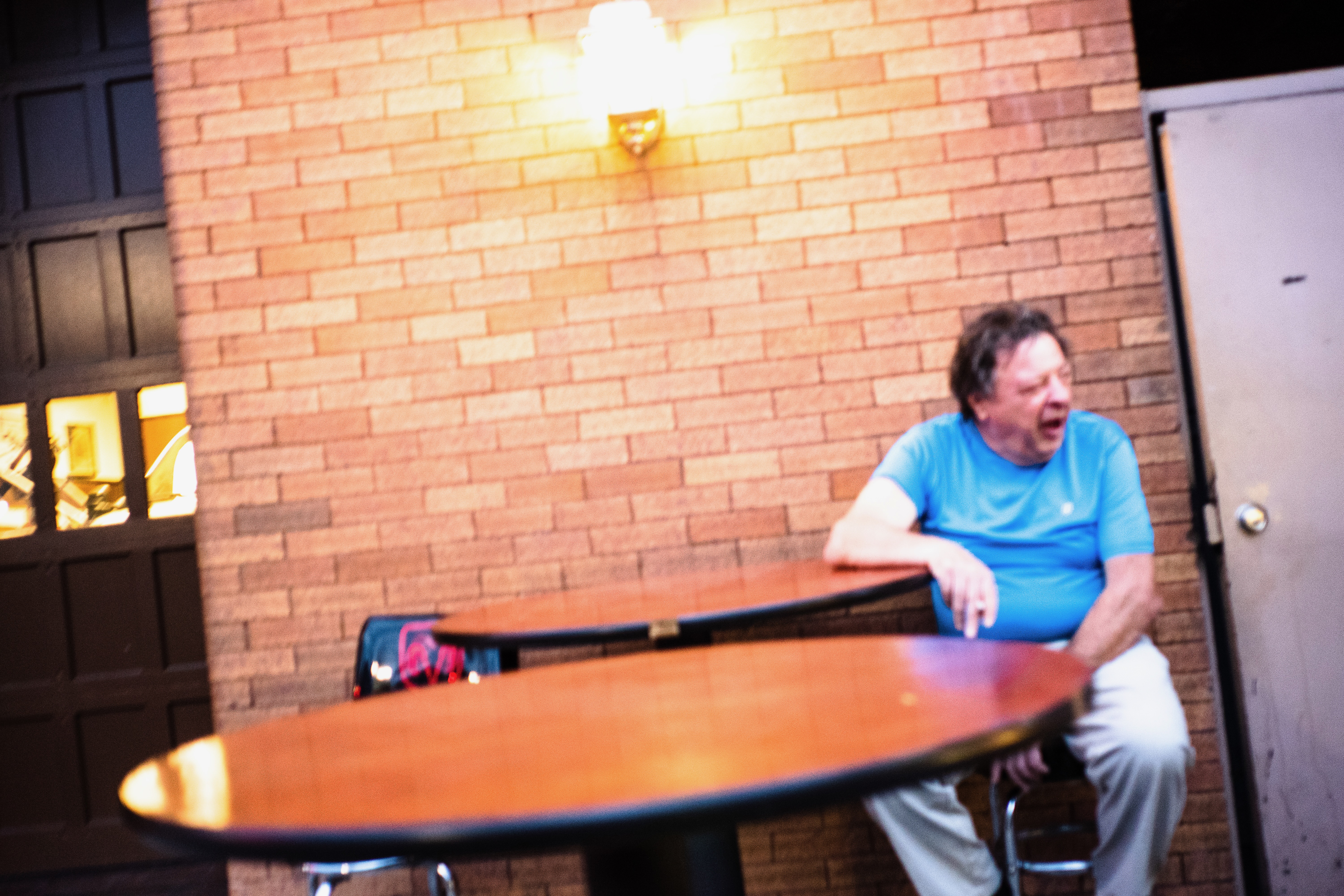 In this candid scene, an older man in a bright blue shirt sits beside a round table, appearing lost in thought or laughter against a warm, textured brick wall. The lighting casts a soft glow, enhancing the relaxed mood while capturing a fleeting moment of solitude. The composition draws the viewer's eye to both the subject and the inviting, yet abandoned, table space beside him.