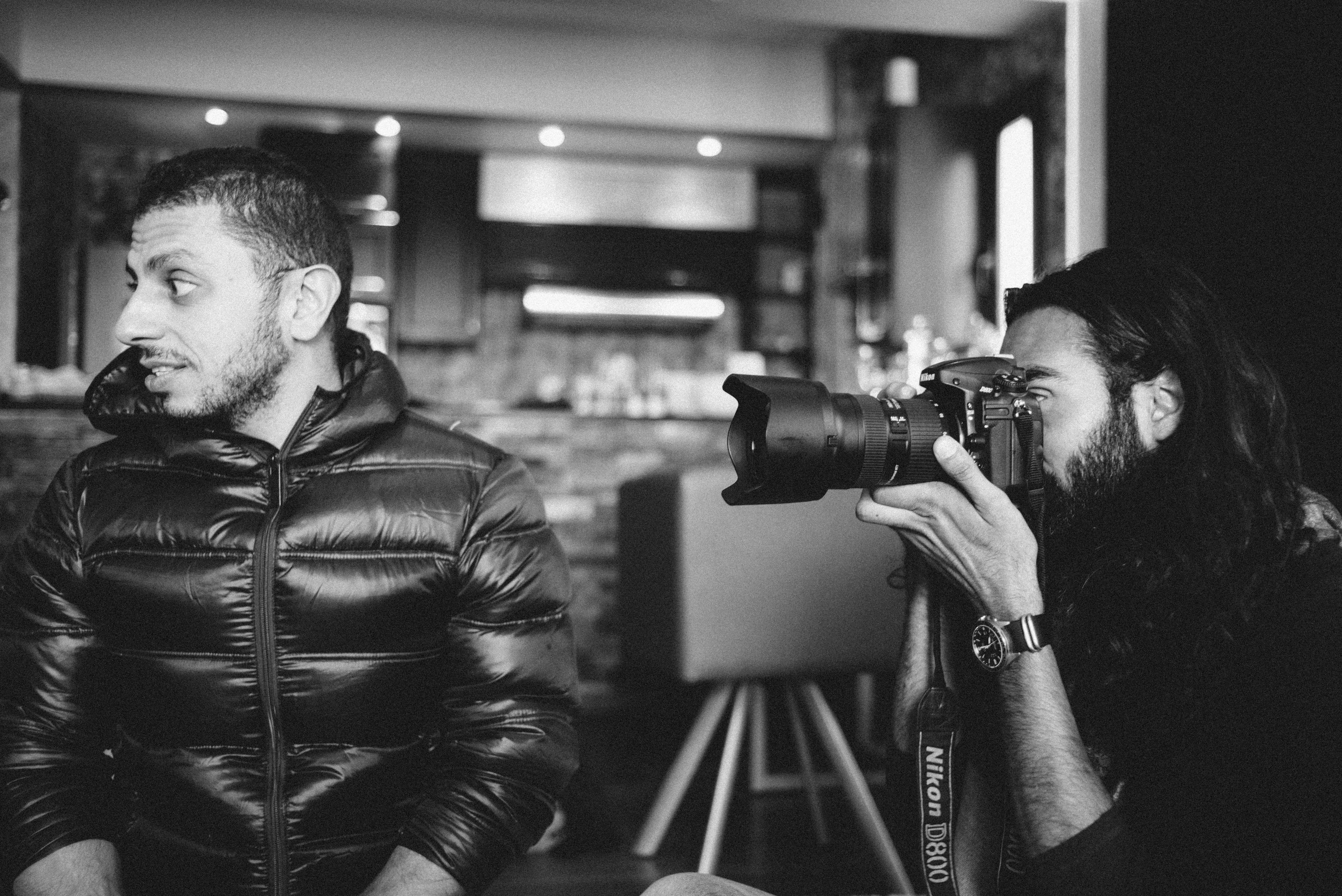 In this intimate black-and-white portrait, a man in a puffy jacket peers subtly to the side, while another figure, partially blurred, aims a camera at him, creating a dynamic interplay of observer and subject. The soft lighting enhances the candid atmosphere, evoking a sense of spontaneity and connection between the two individuals. The sleek composition draws the viewer's eye between the engaged expressions, encapsulating a fleeting moment of creativity and collaboration.