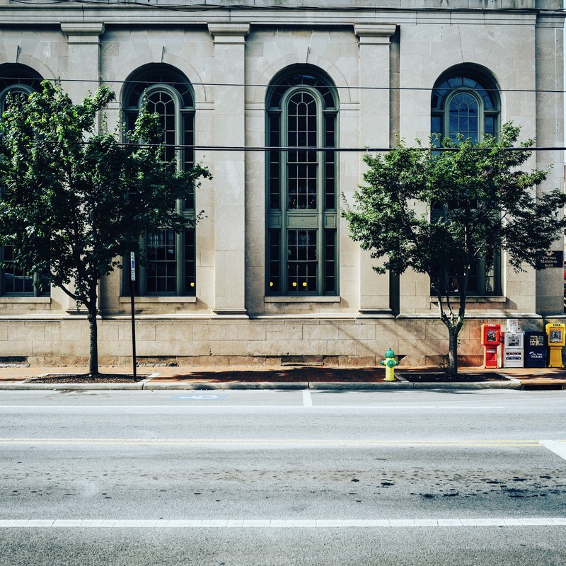 The photograph captures a serene urban scene, featuring a stately building with arched windows framed by lush trees. The composition highlights the contrast between the structured architecture and the natural elements, while soft, diffused light adds a warm glow to the scene. This tranquil moment is punctuated by elements like a fire hydrant and newspaper boxes, subtly grounding the viewer in daily city life.