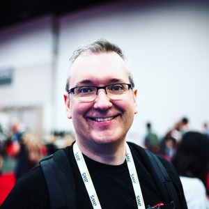 The photograph captures a cheerful individual standing prominently against a blurred backdrop of a bustling event. The warm smile and bright demeanor convey a sense of friendliness and enthusiasm, while the soft lighting enhances the approachable mood of the scene, inviting engagement.