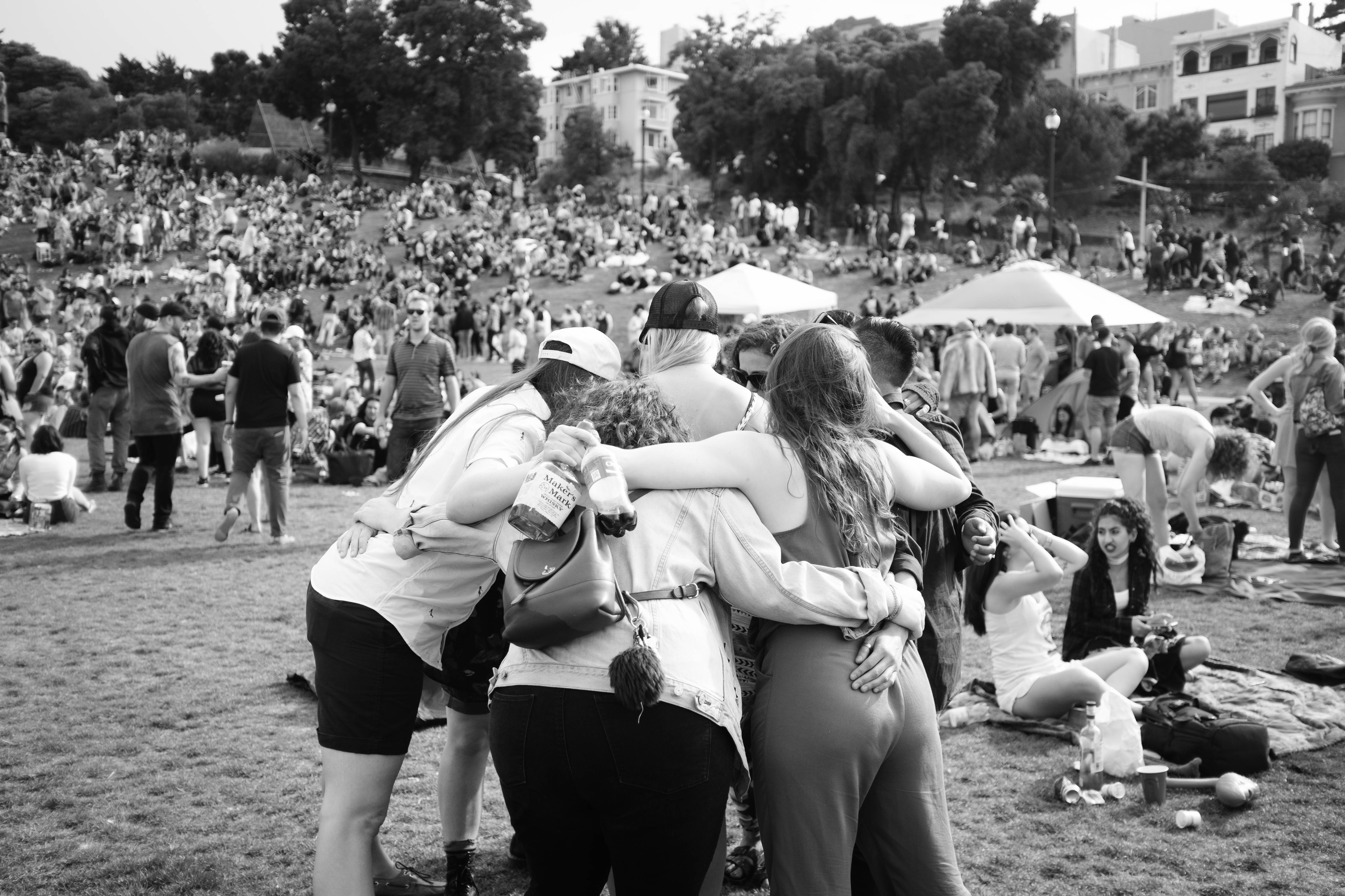 In this black-and-white photograph, a group of friends share a warm embrace in the foreground, encapsulating a moment of connection amidst a bustling park filled with people. The composition creates a striking contrast between the intimacy of the group and the lively atmosphere surrounding them, while soft lighting enhances the nostalgic mood of the scene. The juxtaposition of vibrant social activity and quiet camaraderie evokes a deep sense of joy and togetherness.