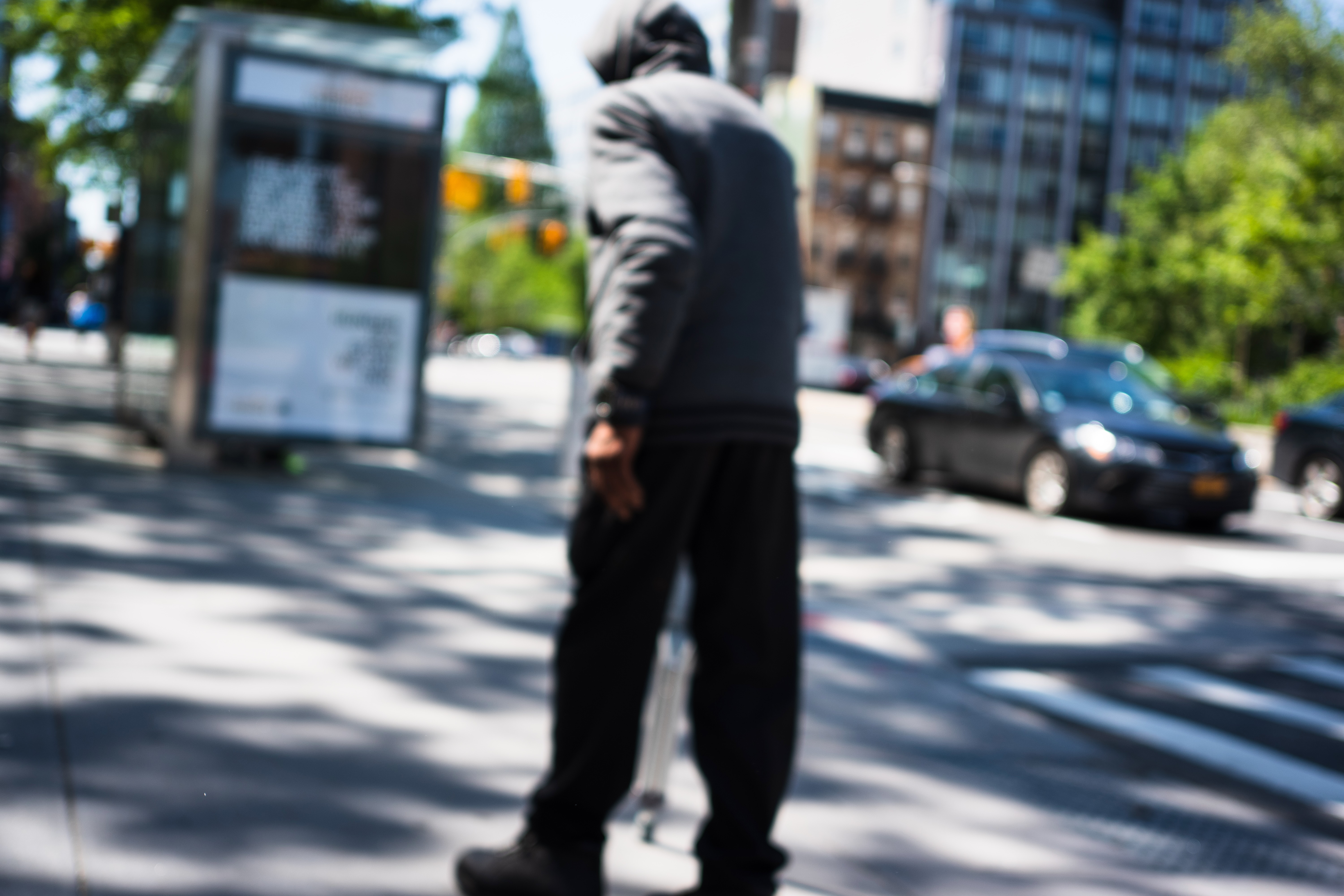 In this candid street scene, a figure in a gray hoodie walks with a cane, partially obscured by motion blur that enhances the sense of fleeting urban life. The contrasting shadows and bright sunlight illuminate the surrounding environment, evoking a sense of solitude amid the city’s hustle and bustle. The blurred background and sharp focus on the subject create a poignant moment of introspection against the backdrop of everyday chaos.