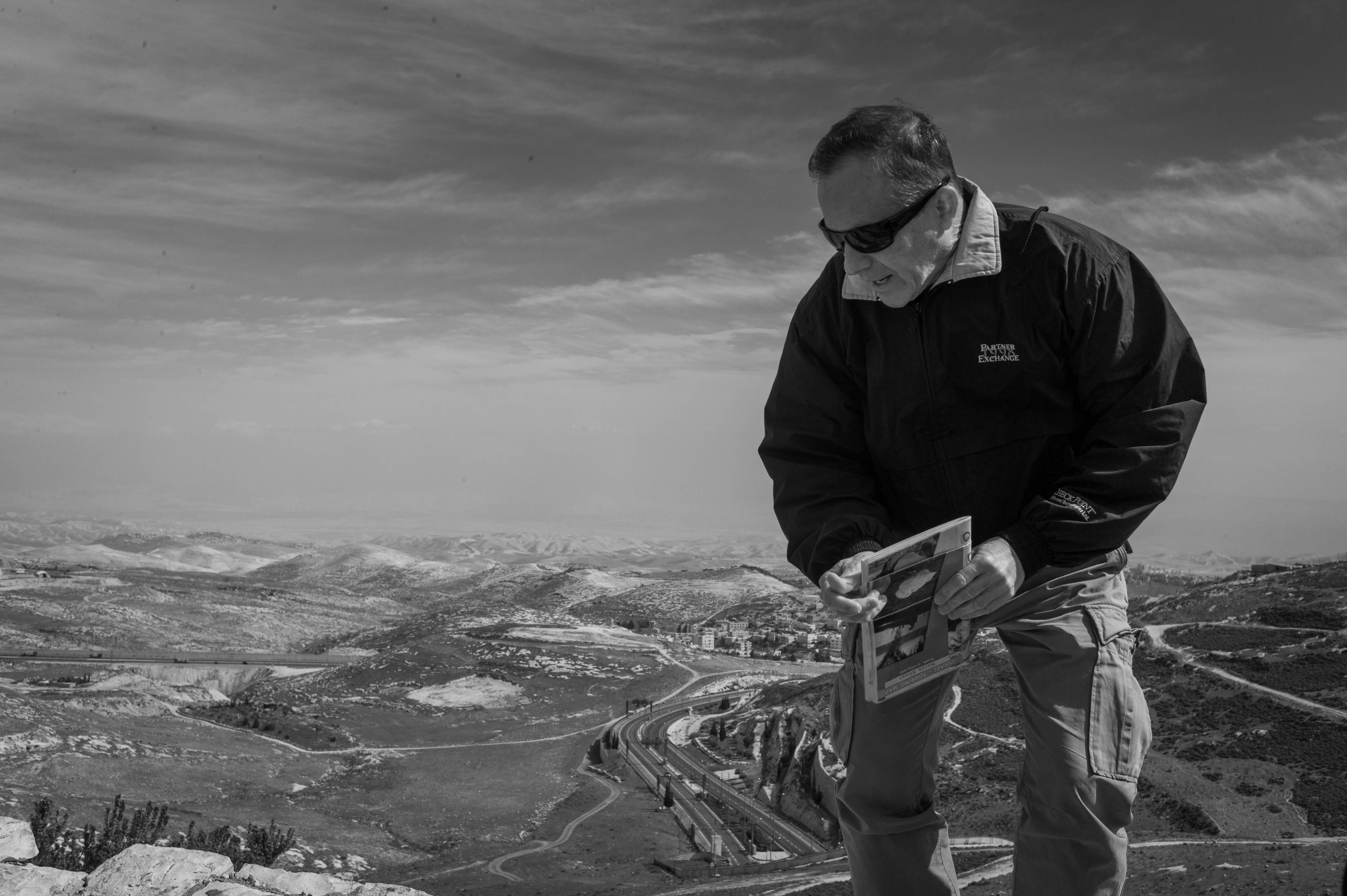 In this striking black-and-white photograph, a man stands on a rocky outcrop, deeply engaged in looking at a photograph he holds in his hands. The expansive backdrop of rolling hills and winding roads under a vast sky enhances the contemplative mood, while the contrasting tones highlight the subject's intense focus against the serene landscape.