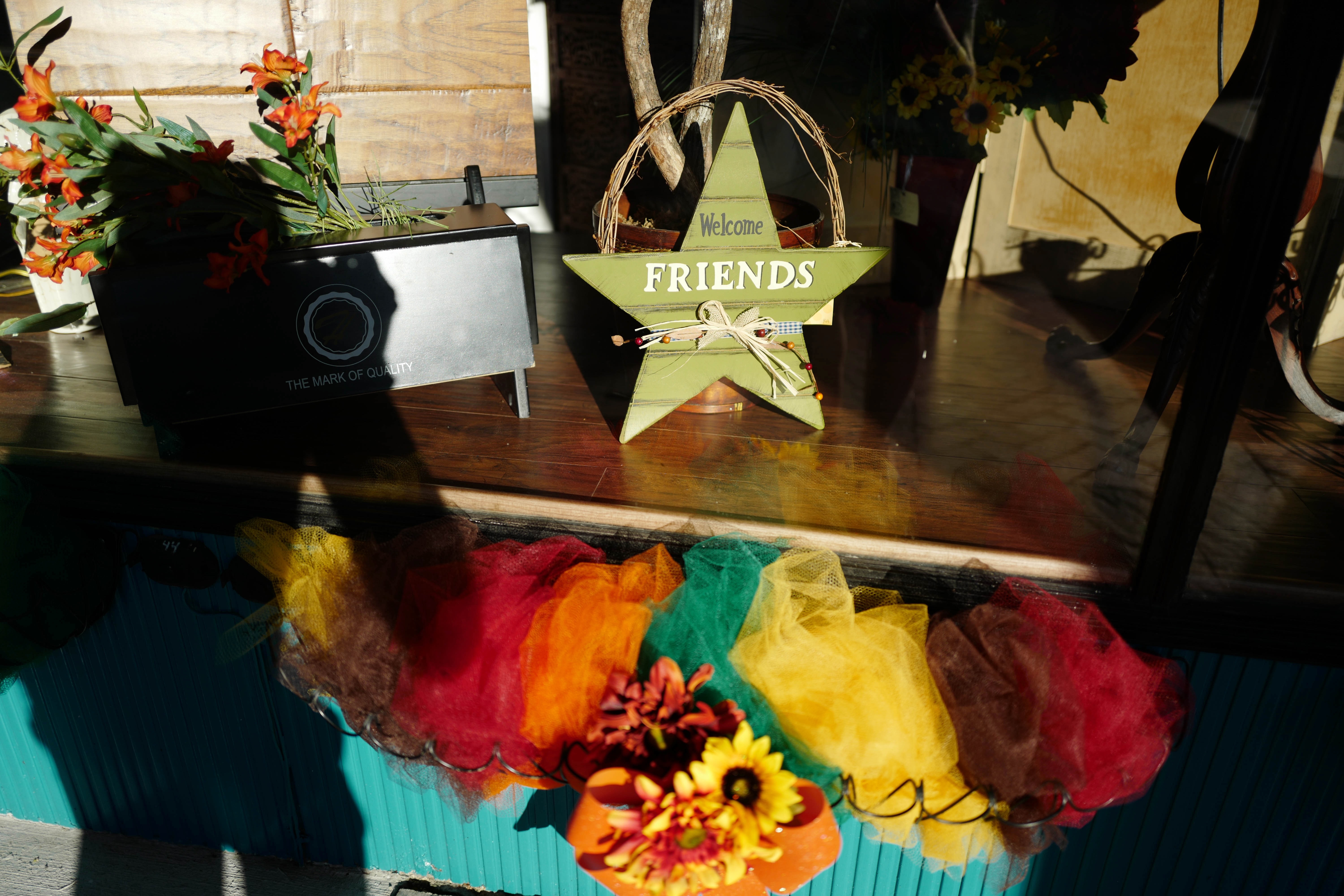 The photograph captures a charming display of a green star-shaped sign that reads 'Welcome Friends,' nestled among colorful festive decorations. Warm sunlight filters through, casting a gentle glow on the rustic elements, creating a cozy and inviting atmosphere. The vibrant colors of the embellishments evoke a sense of joy and celebration, perfectly embodying the spirit of the season.