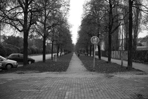 This black-and-white photograph captures a serene, tree-lined walkway flanked by leaf-strewn ground, evoking a sense of quiet reflection. The moody lighting and absence of vibrant colors enhance the stillness, while the distant figures suggest a gentle, solitary journey. Parked cars add a modern contrast to the tranquil, nature-infused path, creating an inviting yet contemplative atmosphere.