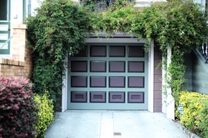 A garage door framed by vibrant greenery creates a harmonious blend of nature and architecture. The soft lighting highlights the textures of the leaves, casting gentle shadows that evoke a serene mood. The muted colors of the door contrast beautifully with the lush foliage, inviting the viewer into a tranquil urban retreat.