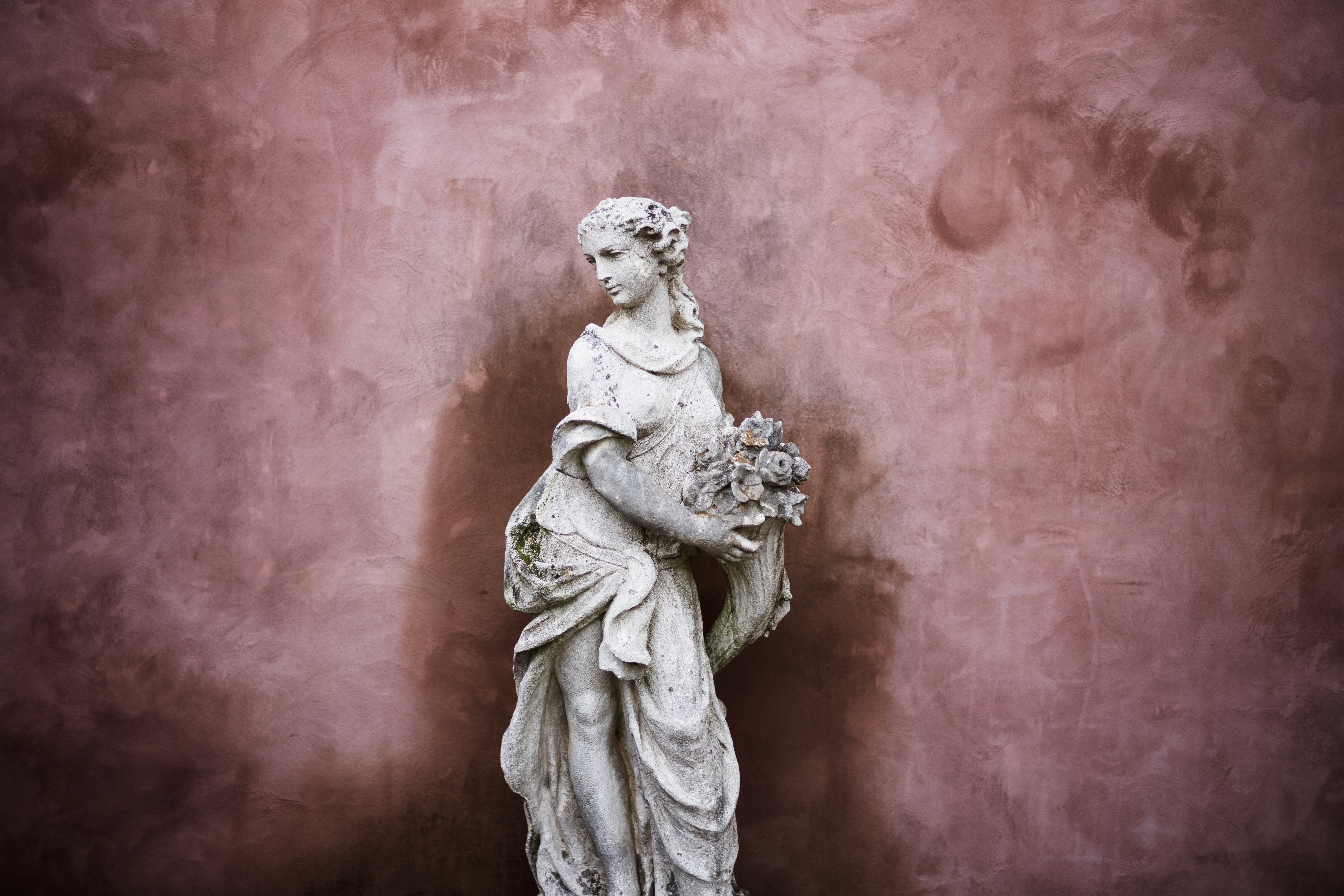 The photograph captures a weathered statue of a young woman, gracefully holding a bouquet, set against a soft, muted pink wall. The delicate textures of the stone contrast beautifully with the smooth background, creating a serene and timeless atmosphere. The soft lighting enhances the mood, evoking a sense of nostalgia and quiet contemplation.