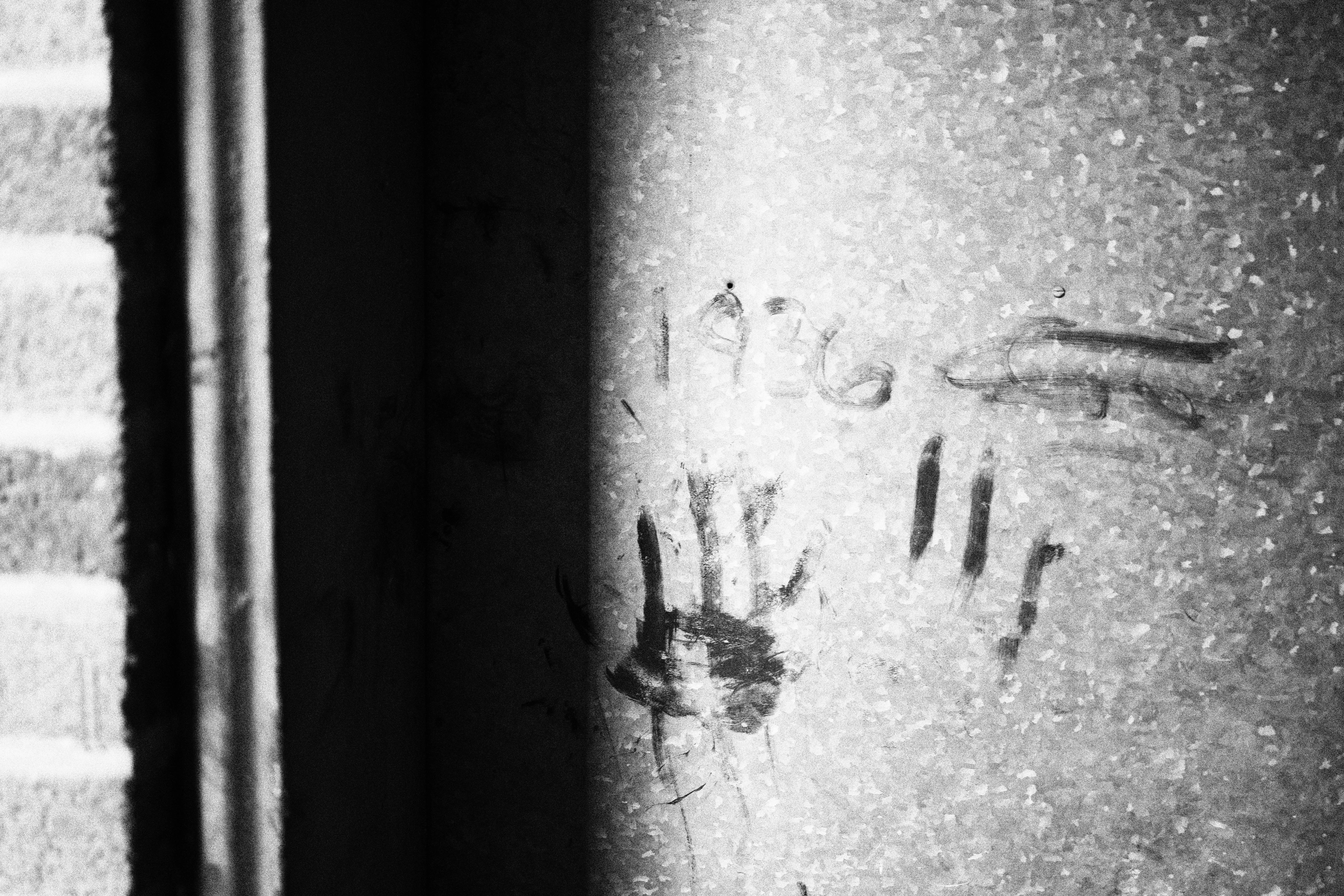 This monochromatic photograph captures the haunting traces of a handprint and the year '1936' inscribed on a textured surface. The interplay of shadow and light accentuates the starkness of the marks, evoking a sense of forgotten history and nostalgia. The close framing and muted tones invite contemplation on the passage of time and human existence.