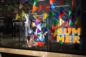 This photograph captures a lively retail window display adorned with colorful triangular pennants, emphasizing the warm and cheerful theme of summer. The mannequins showcase stylish summer outfits, exuding a playful spirit, while bold lettering announces 'hello SUMMER.' The bright, inviting colors and strategic lighting create an engaging atmosphere that draws the eye and evokes a sense of excitement for the season ahead.