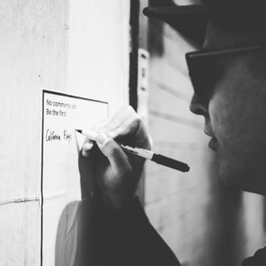 In this black-and-white photograph, a person inscribes the words 'California Flays' on a blank comment sheet plastered against a weathered wall. The intimate close-up captures the concentration in their posture and the deliberate motion of the hand, evoking a sense of quiet rebellion. Natural light softly highlights the textures of the wall and the subject's focused demeanor, creating a contemplative mood.