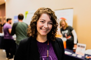 The photograph captures a young woman with a warm smile, standing confidently in a bustling event atmosphere. Soft, natural lighting accentuates her expressive features and curly hair, while blurred figures in the background imply a lively gathering. The mood is inviting and positive, highlighting her engagement and enthusiasm in the setting.