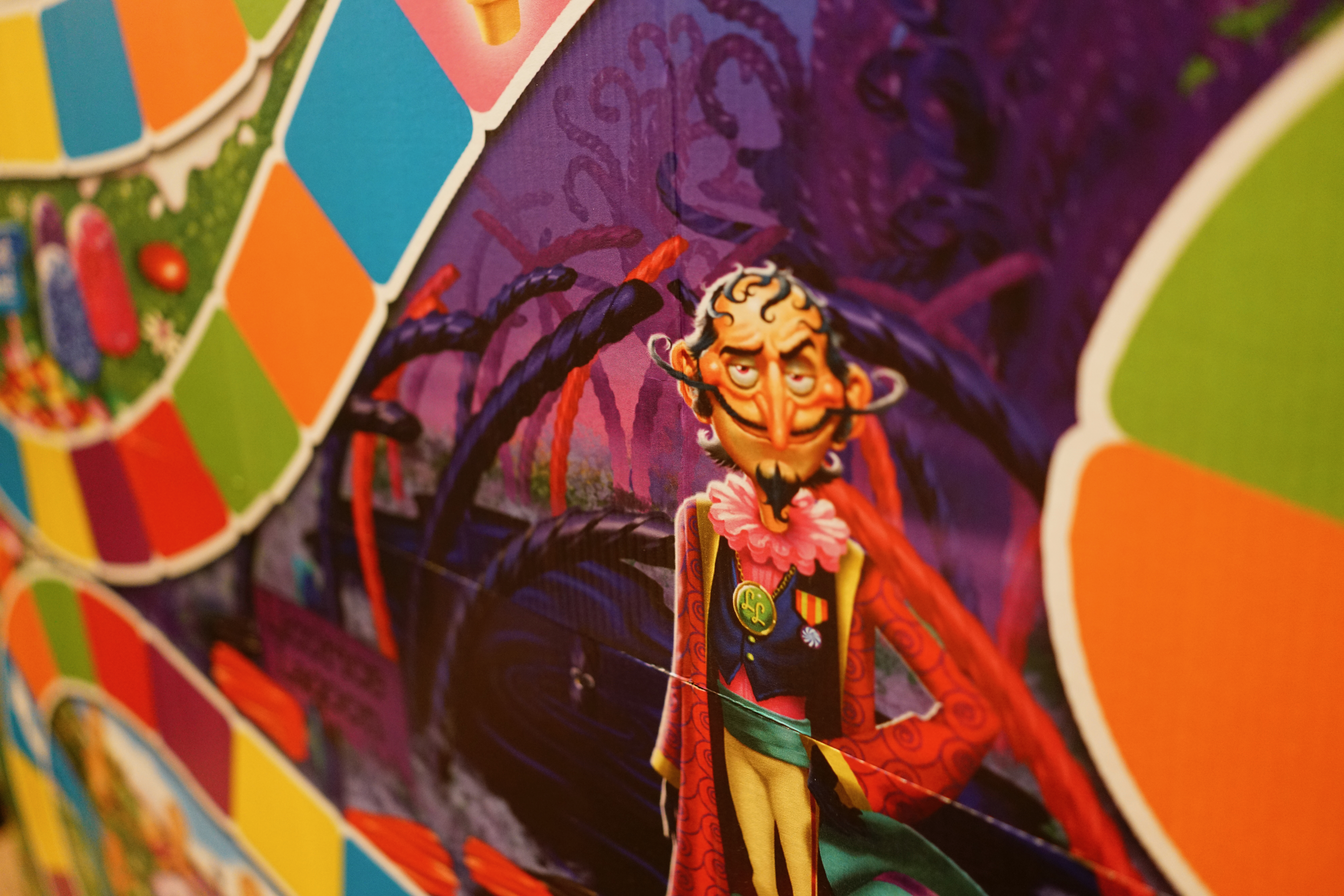 The photograph captures an intricately illustrated character from a game board, dressed in flamboyant attire with an expressive face that exudes a mix of cunning and charm. The composition emphasizes the vibrant colors of the gameboard, with contrasting geometric shapes enhancing the whimsical mood. Soft lighting adds depth to the illustration, inviting the viewer to delve into a playful world of imagination.