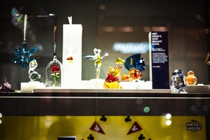 The photograph features an enchanting display of colorful glass figurines, showcasing beloved characters and objects. Soft, ambient lighting casts a gentle glow over the intricate details, creating a playful and nostalgic atmosphere. The arrangement draws the eye, inviting viewers to appreciate the whimsy of each piece against a backdrop of subtle elegance.