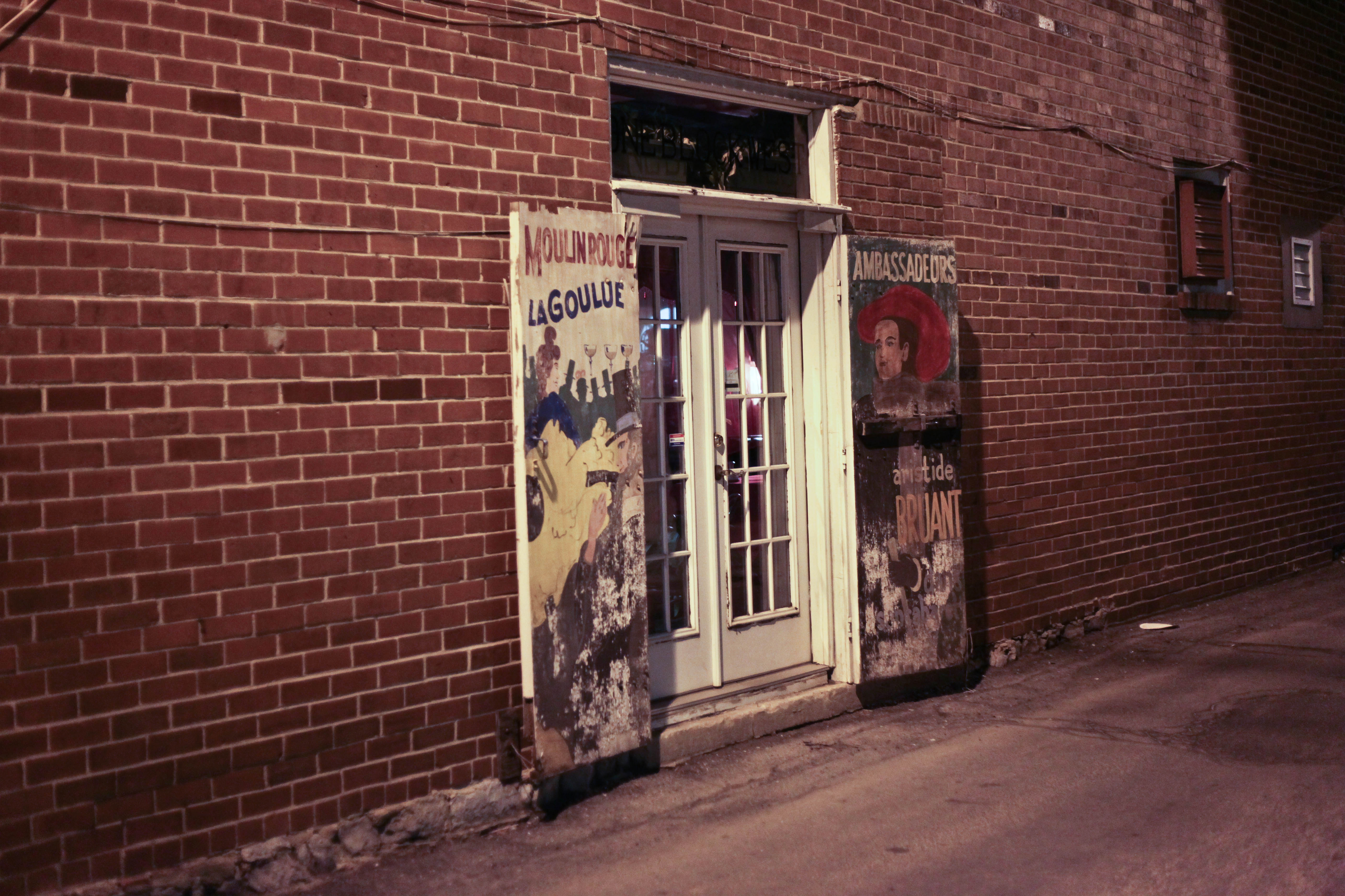 The photograph captures a weathered entrance adorned with vintage posters, inviting curiosity through its intimate alleyway setting. Soft, muted lighting accentuates the rich textures of the brick walls, evoking a sense of nostalgia and hidden stories. The air feels thick with an almost tangible history, suggesting a once-vibrant hub now softly whispered about in its quietude.