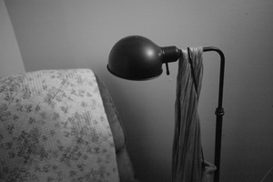 This monochrome photograph captures a solitary lamp draped with a silk scarf in a cozy nook. The soft, diffused lighting creates a serene mood, while the subtle textures of the fabric contrast with the smooth lines of the lamp, inviting introspection. The composition emphasizes a sense of quiet comfort, making it an inviting spot for reflection or reading.