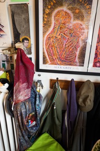 The photograph captures a vibrant corner of a personal space, showcasing a blend of clothing and art that suggests a unique personality. A colorful artwork by Alex Grey dominates the background, exuding warmth and intimacy, while various fabrics and hats hang in a casual, almost whimsical arrangement. The lighting is soft and inviting, enhancing the eclectic mood of this intimate setting.