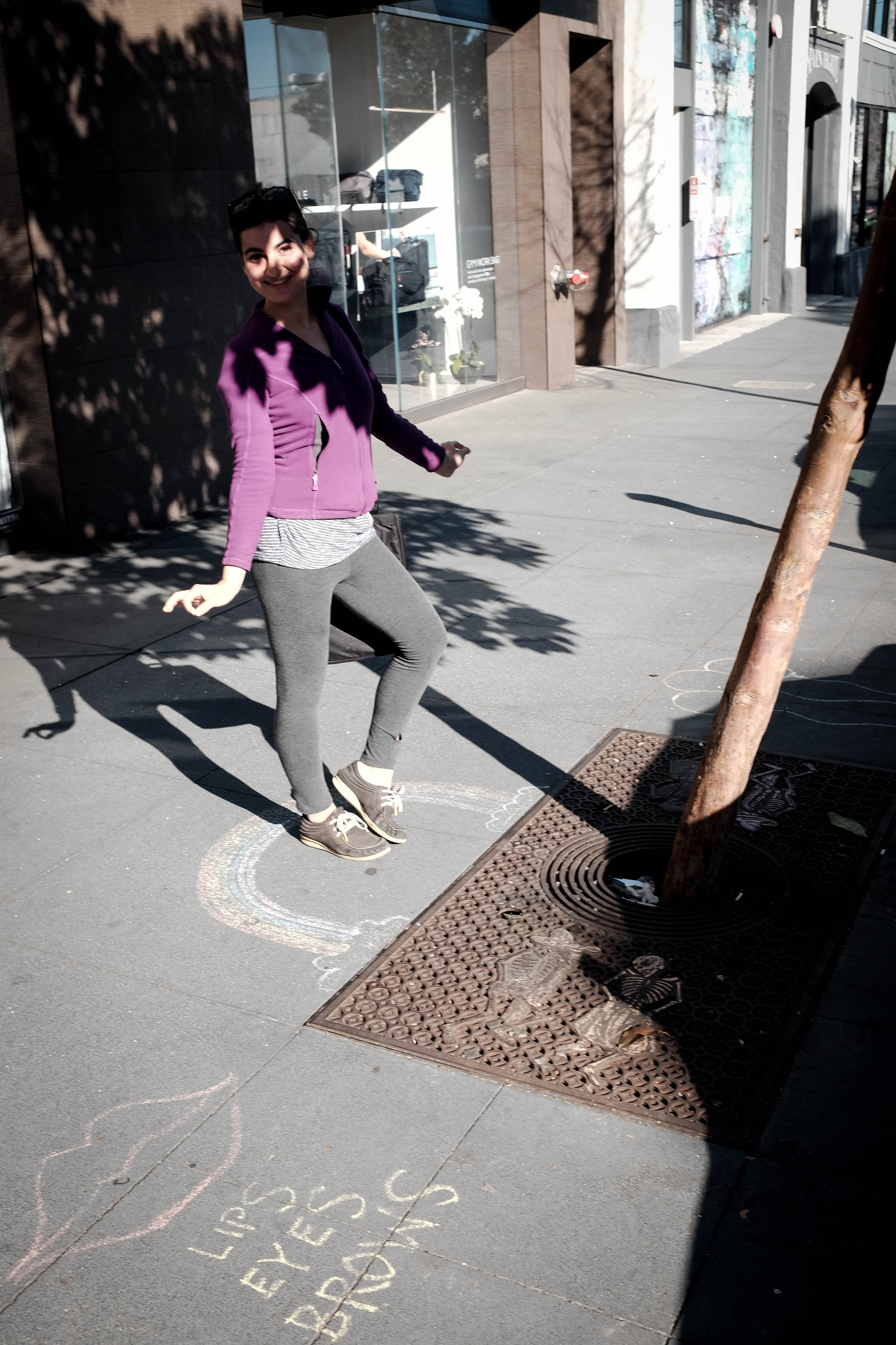 In a sunlit urban setting, a young woman exudes playful energy as she dances on the sidewalk. Vibrant chalk drawings beneath her feet add a whimsical touch, contrasting with the sleek, modern architecture in the background. The lighting casts soft shadows, enhancing the cheerful mood of the scene.