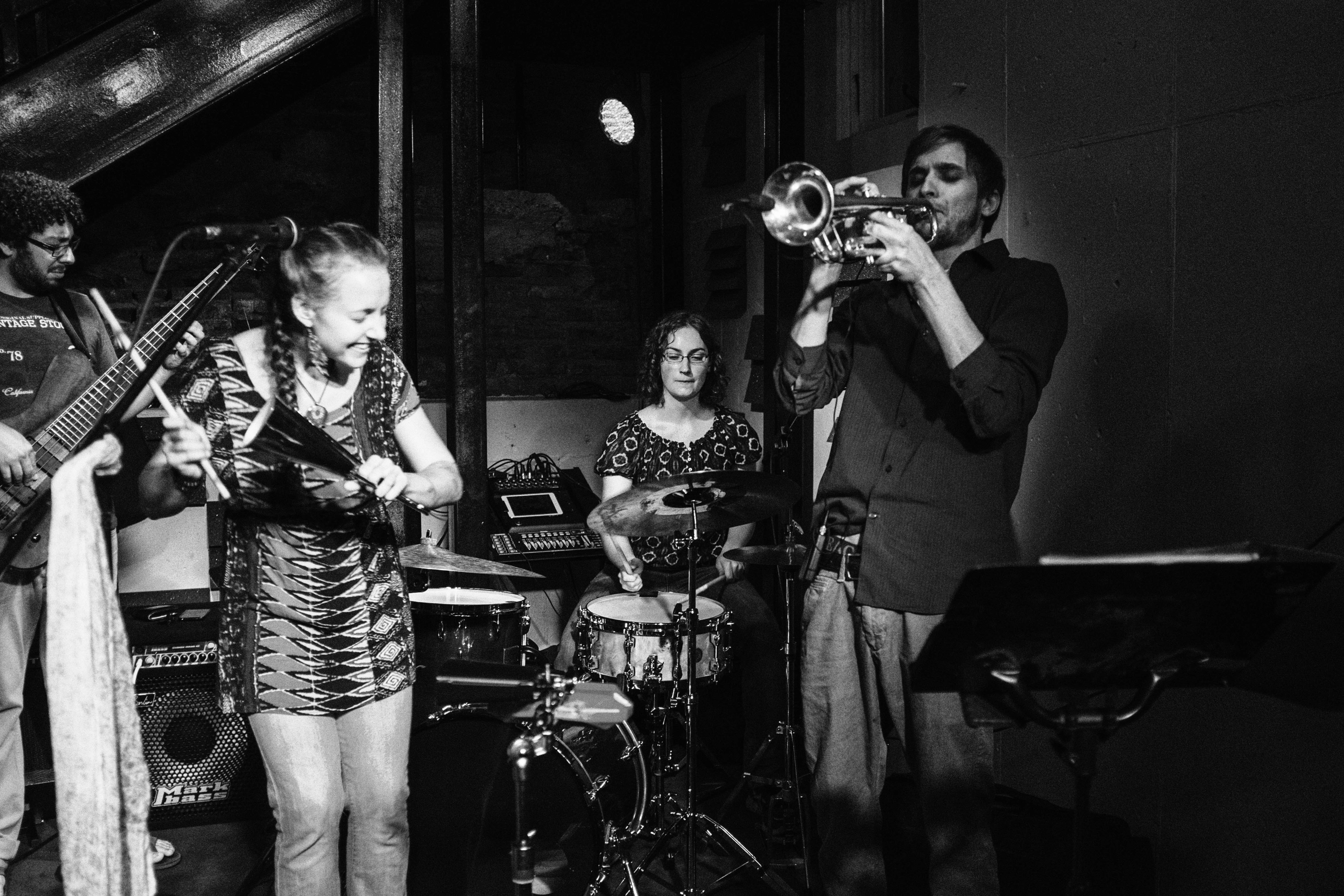 In a dimly lit venue, a spirited band captivates the audience with their energetic performance. The musicians, each absorbed in their craft, create a vibrant atmosphere filled with the joy and connectivity of live music. The contrast of shadows and soft lighting adds a nostalgic charm, inviting the viewer into this intimate moment.
