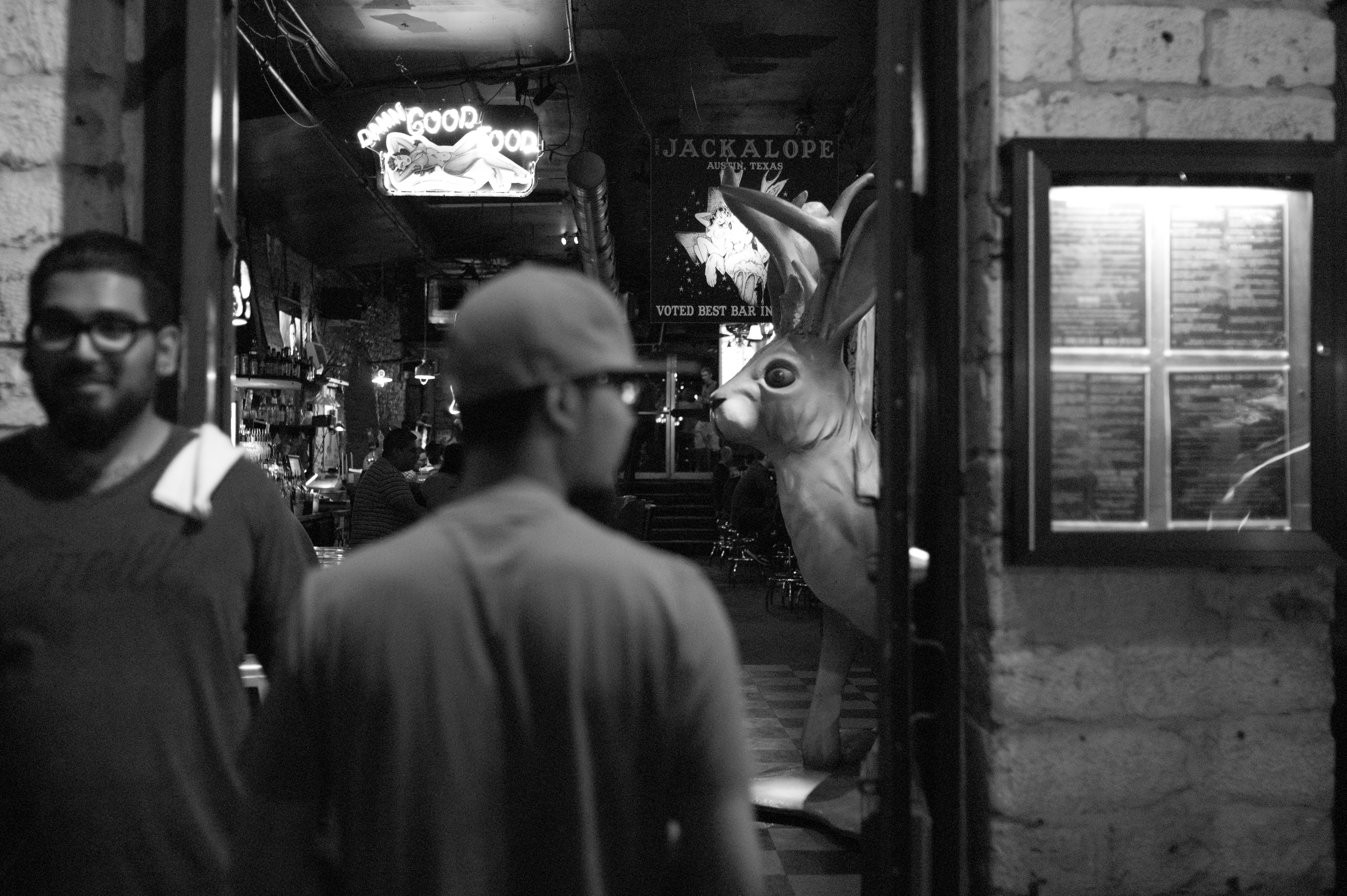 In this striking black-and-white photograph, a quirky interior is framed by the doorway of a bar. A large, surreal rabbit statue dominates the scene, contrasting with the casual patrons outside, while dim lighting sets a playful yet mysterious mood. The juxtaposition of figures and the whimsical decor creates a captivating narrative about nightlife and unexpected encounters.