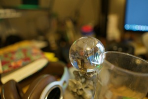 This photograph captures a crystal ball resting amidst a cluttered workspace, emphasizing the serene amidst the chaotic backdrop. The soft lighting highlights the reflections within the ball, creating a dreamlike contrast to the disarray of notebooks and gadgets surrounding it. The composition draws the viewer's eye to the orb, inviting contemplation of the fragmented scenes it reflects.