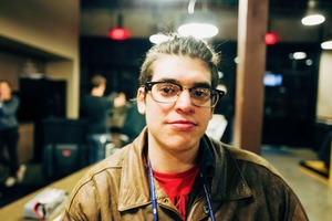 The photograph captures a young man in a leather jacket, exuding a calm confidence amid a bustling background. Soft, diffused lighting highlights his features, creating an intimate and contemplative atmosphere, while the blurred figures behind him suggest a vibrant social scene. The composition draws the viewer's eye directly to his serene expression, contrasting with the lively surroundings.