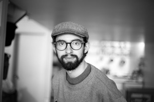 The photograph captures a young man with a thoughtful expression, donned in a simple sweater and a flat cap. The soft black-and-white tones add a nostalgic mood, with gentle lighting highlighting his features against a blurred, understated background. The direct gaze invites connection, creating an intimate atmosphere that feels both personal and reflective.
